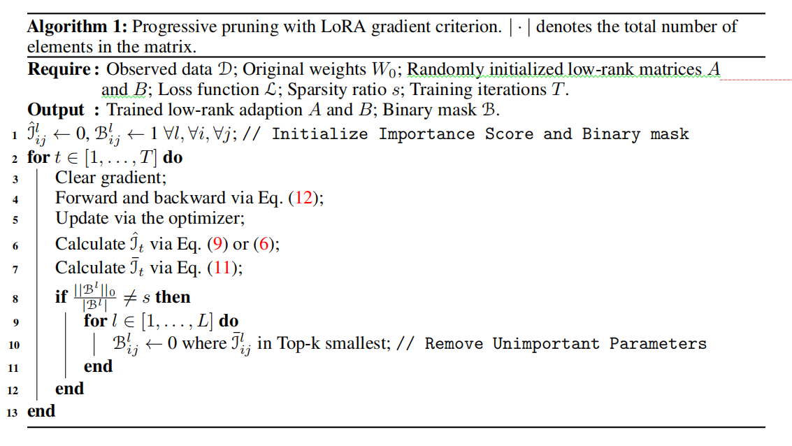 微调lora(保留增量梯度)->计算重要性->加权分解SVD->W=BA+S剪枝(剪枝S,微调BA)
