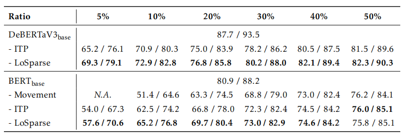 Baselines: Full fine-tuning 、Movement pruning、Iterative pruning (ITP)