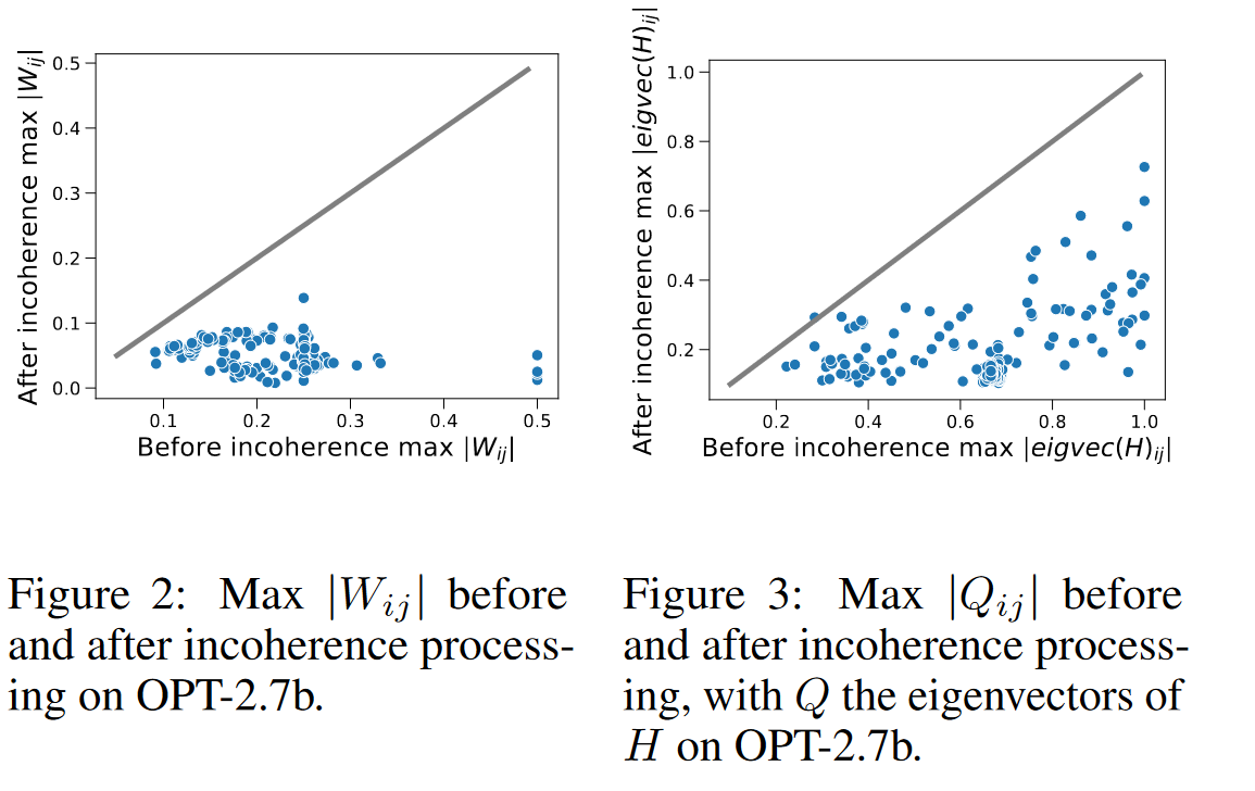 为什么在权重矩阵 $W$ 和 Hessian 矩阵 $H$ 中引入不一致性是有益的。首先指出,大多数的 $n \times n$ 矩阵具有与 $\mu = O(\sqrt{\log n}) = \tilde{O}(1)$ 的不一致性,这是因为一个随机正交矩阵的元素的平方大小集中在它们的平均值 $1/n$ 附近。因此,在权重矩阵 $W$ 中引入不一致性可以被视为一种异常值(outlier)减少的形式:对其元素的大小施加一个较小的边界意味着我们不需要那么大程度地对其进行缩放,以使其适应可表示的低精度数的有限范围。Figures 2 和 3 绘制了在 OPT-2.7b 的所有层中,在我们的不一致性处理前后的最大权重和 Hessian 特征向量的绝对值。参考线上的斜率为1。我们看到在我们的不一致性处理应用后,权重矩阵 $W$ 和 Hessian 矩阵 $H$ 更不一致($\mu 更小$)。虽然使 Hessian 矩阵 $H$ 不一致性不太直观,但其效用由以下引理所激发。